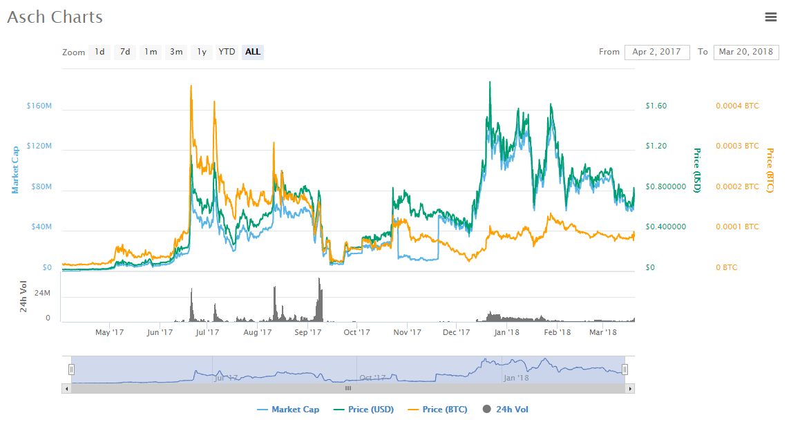 Like many of the cryptocurrencies in 2017, Asch was attracting a low price. Up until mid-2017, the crypto had only touched $0.1 maybe once or twice. Upon the cryptocurrency craze setting in, the price of the coin started to rise to reach a high of $1.89. The highest market cap reached in 2017 was $156 million and the highest 24-hour traded XAS for the same year were worth $41 million.