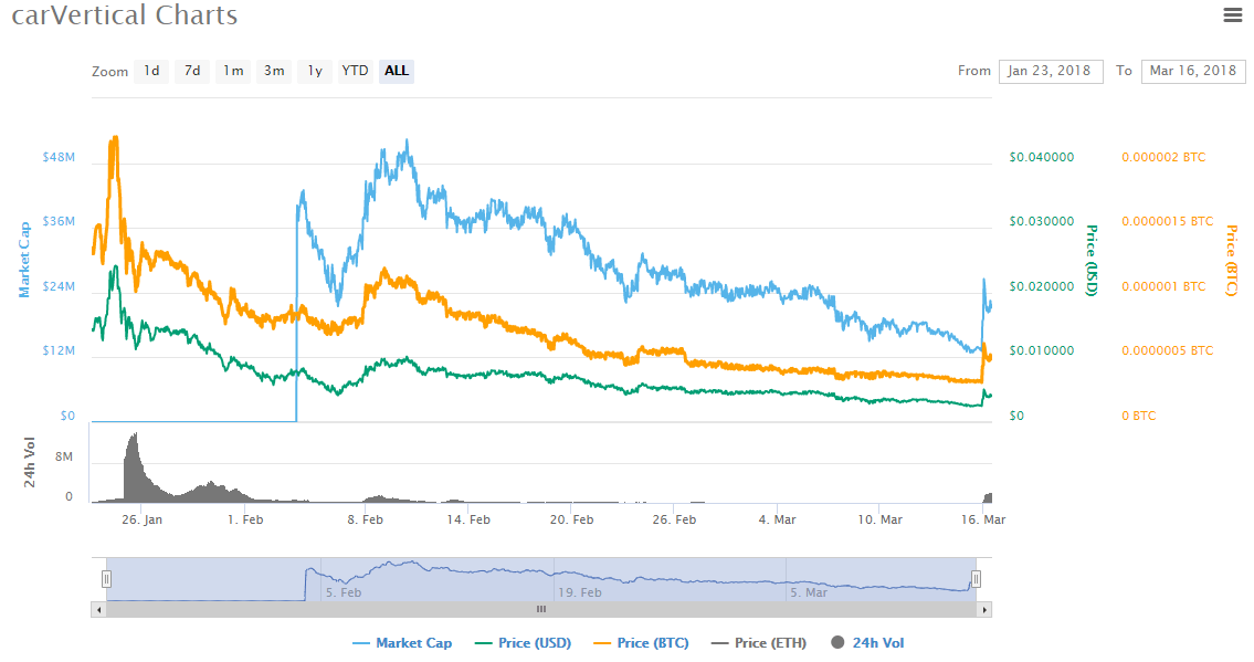 CarVertical whose ticker symbol is CV is based on the Ethereum blockchain. The platform takes information from numerous centralized databases and then writes this information on the blockchain. The platform gets access to Interpol databases, leasing, police, and country registries and any other database which might ensure the information about a car is complete. The developers of the crypto are developing products which will enable users on the platform to gather information about their cars, manage their car’s registration and do much more.