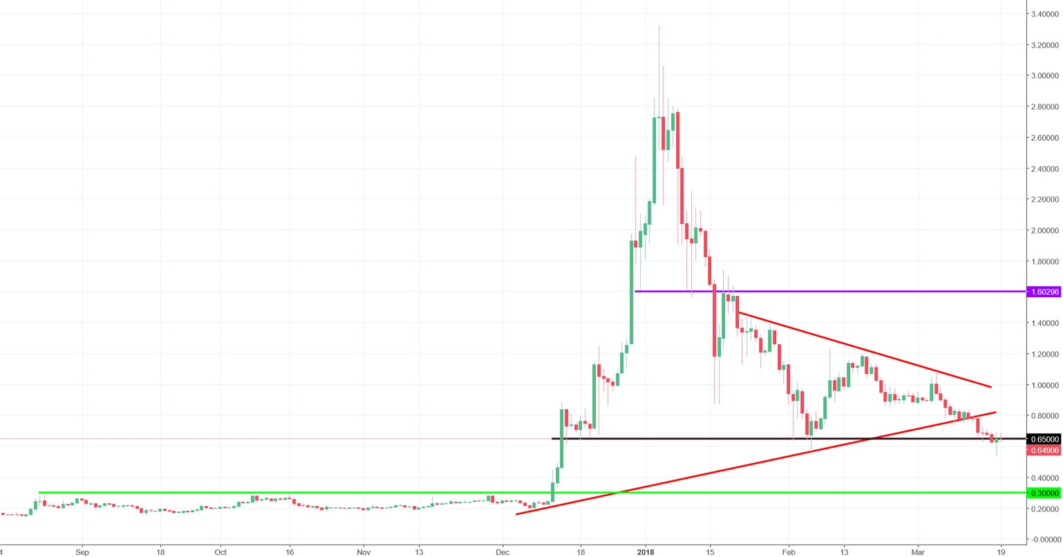 „ Currently, the price is attacking the mid-term up trendline (lower red) and it looks like this attempt will finish with a bearish victory (no signs of a demand whatsoever)…As for the potential targets for this drop, we do have two here: 0,65 (black) and 0,3 (green). Chances that we will get there in the nearest future are quite high, especially considering the global atmosphere around the cryptos and the scale of the recent reversal. „