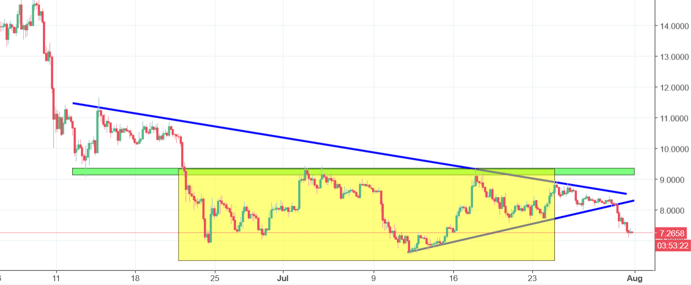 In the next few days, the price was indeed climbing higher. On the 9th of June, EOS managed to climb slightly above the 15 USD. That was it. The resistance was tested again and again stopped the demand. That gave a clear signal to all crypto traders: EOS is weak and do not go there. The price went significantly lower making new minimums on the 6,6 USD in the middle of July.