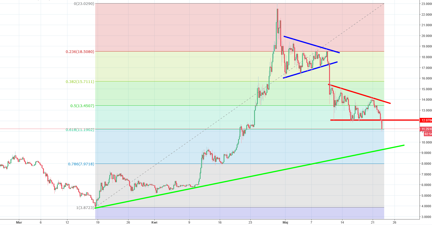 Back in that day, the price was around the 15 USD and the 50% Fibonacci was on the 13.44 USD. What is very interesting here, is that since those words were written, the price was only lower. You have to admit that it was a very good call. From the 11th of May, till now, the price created the descending triangle pattern (red lines) and did what was expected – broke the lower line of this formation.