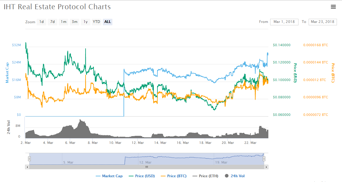 On March 10th, the market cap of IHT shot from zero to $21 million. The IHTs traded on that day were worth $1.9 million. In the days that followed, the market cap has more or less been the same. On 22nd, the token’s cap was $23 million while volume traded stood at $7.9 million. The closing price was $0.110 while the highest one for the day was $0.113. At around 1100CET on 23rd, the token was going for $0.099 while volumes traded were $6.2 million.