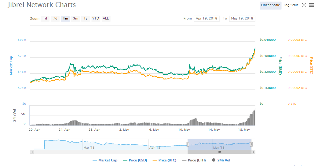 In early February 2018, the Jibrel token started at an average price of $0.6. This was immediately after Bitcoin touched a year-low of $6,000 on Feb 6th. The token remained above $0.5 until early March when the price started gradually but steadily sliding down. This went on until April 8th when it closed at $0.167. The price then rose until it reached a new high of $0.5 on Friday, May 18th. On Saturday, the token gained by more than 34% to trade at $0.569.