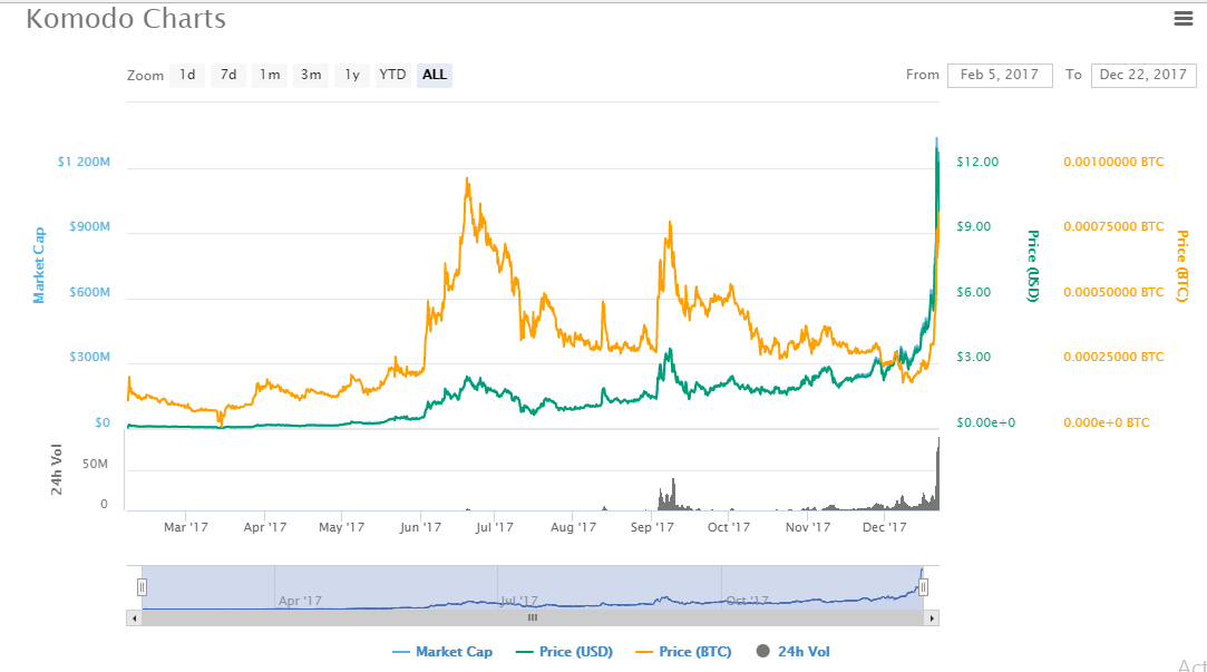 On December 10th, Komodo was going for $2.73 while its market cap stood at $283 million. On 21st, the coin reached an all high of $12.68. Market capitalization touched a high of $1.24 billion on 22nd. In just over two weeks, this coin grew by over 460%. This makes it one of the biggest gainers in the month of December 2017.