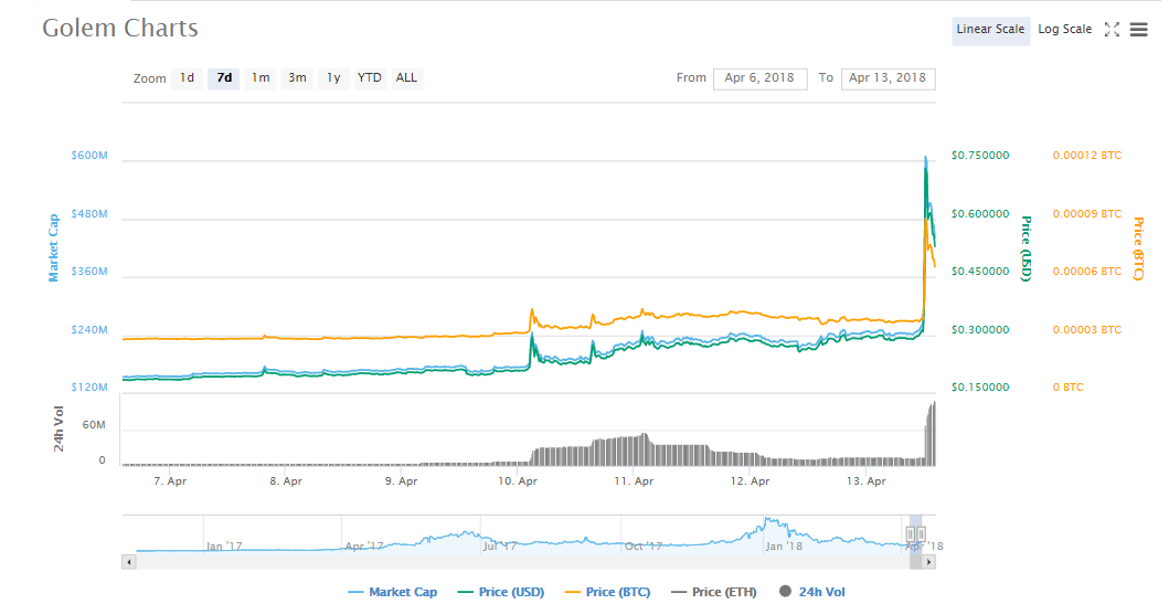 On April 6th, GNT token closed the day at $0.186. Over the week it has gained in value to close at $0.299 on April 12th. The volumes have been moderate in the course of the week having risen from $5 million to $14 million on Thursday. At around 1130 hours, the volume spiked to surpass $101 million. The market cap of the coin stood at $503 million at the time. The gain of the crypto’s price in just 24 hours at the time of writing was 163% ($0.60).