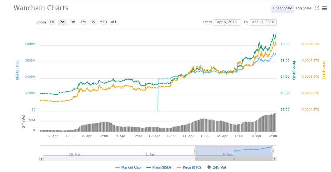 Over the week, Wanchain token has gained in value from $3.02 on 6th April to a high of $6.25 on Thursday. The price rose further on Friday to reach $6.47 which is a 32% gain in the past 24 hours. Over the week the crypto gained with more than 110%. A week ago the 24-hour traded volumes were $5 million and one week later it was $54 million. The market cap for the crypto was passing the $686 million mark Friday.