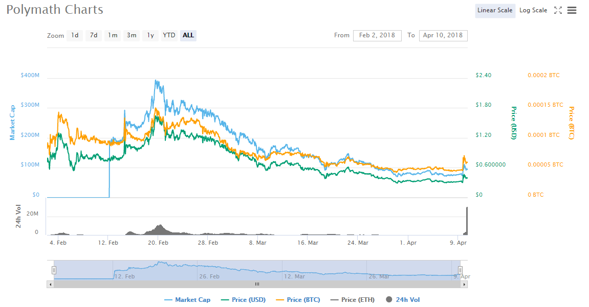 Over the months since the launch of the Polymath ICO, the token has been in some way been emulating Bitcoin. The token started trading on February 2nd and it was attracting a high price of $1.28. Even though the price dropped in the following days, the token reached an all-time high price of $1.6 on February 19th. The volumes traded of this token have always been quite high. There was even a time (Feb. 20th) when the figure was more than $380 million. The figure has since dropped to $30 million on April 10th.