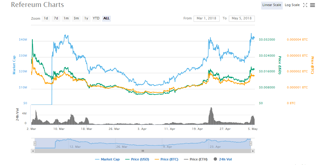 After its launch, the Refereum token reached a high of $0.032 in early March before dropping to below $0.01 in the few days that followed. Just like it has been the case with Bitcoin and other major altcoins, RFR token has maintained a stable but bullish stance for the better part of March and April. It is important to note though that the crypto has touched a low of $0.005 on several occasions in the said months. On May 4th, the crypto closed at $0.0176. The price of the token in the morning hours of Saturday, May 5th, was averaging $0.0177.