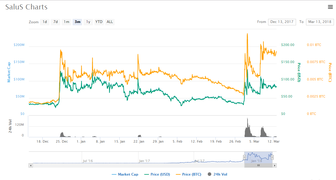 Until March 2017, SaluSCoin was trading below $1. The market cap had never approached the $1 million mark until April 2017 when it passed $1.1 million. It is with the rise of Bitcoin that SaluS cryptocurrency started to peak too. The price of the coin remained below $45 for the better part of December 2017 even while other cryptos were soaring high. The price rose to touch an all-time high of $176 on December 24th, 2017. The price remained relatively high for the better part of January until early February. Like it was the case with Bitcoin, the price of SaluS dropped to a new low of $26. The price has been recovering since then and it closed at $87 on March 11th.