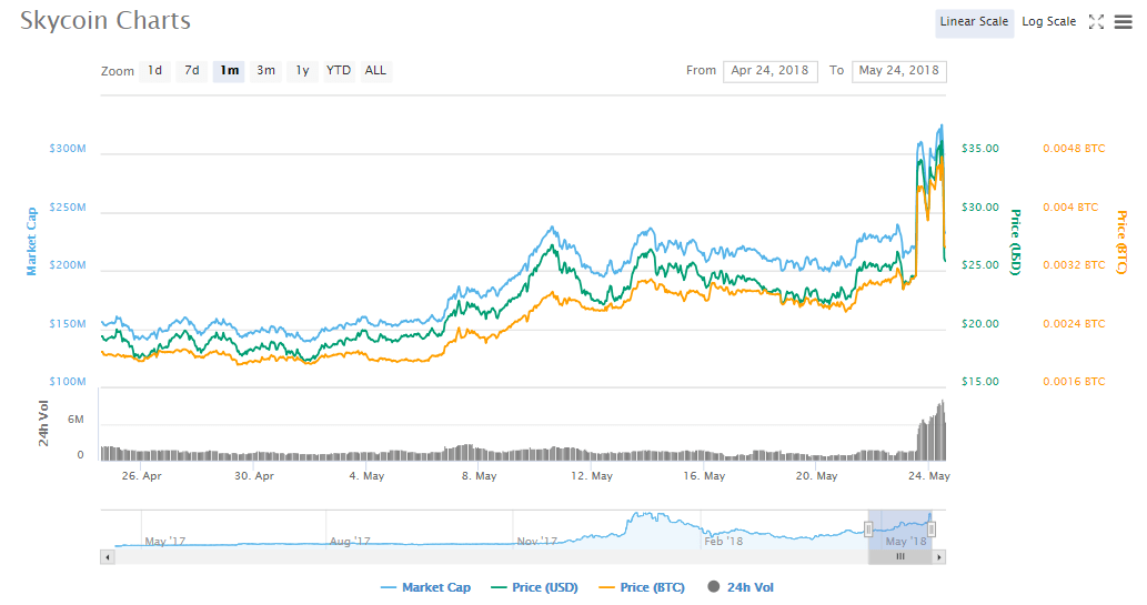 Skycoin is one of the many cryptocurrencies introduced in 2017. The crypto which is a custom-built hardware unit for the new internet is designed to work using efficient mining devices. Until December 1st, 2017, Skycoin crypto whose ticker symbol is SKY hardly passed the $100,000 mark as far as 24-hour volume goes. But just like Bitcoin and Ethereum, the crypto peaked in December to touch a high of $2.5 million. To the surprise of market players, this high was beaten on May 23rd when a new high of 24-hour traded SKY coins totaling to $7.3 million was hit.