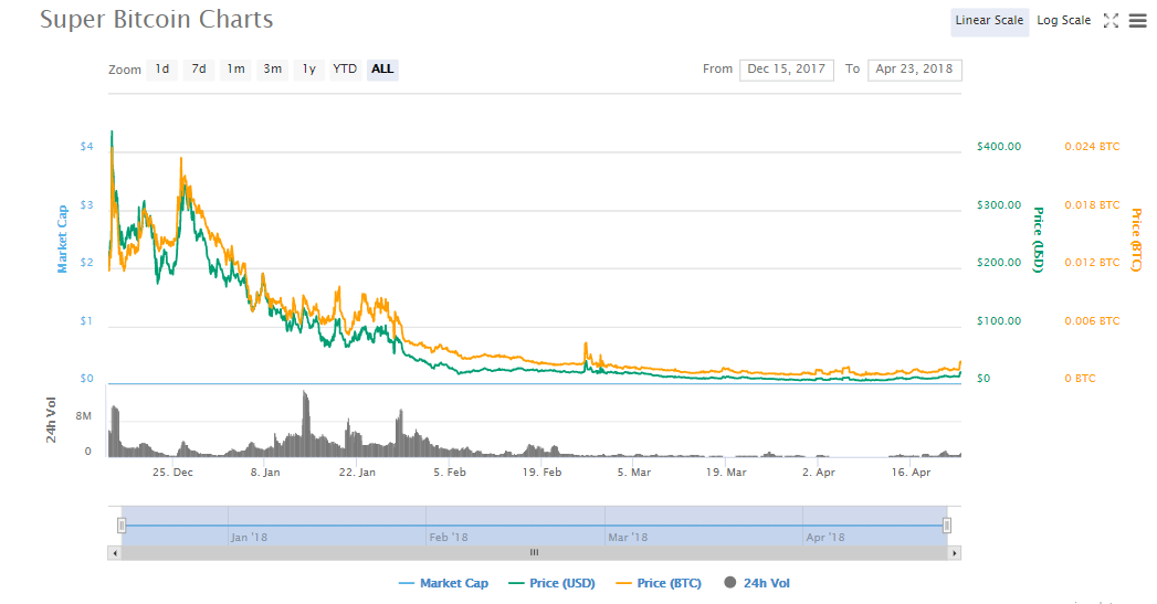 Super Bitcoin can be said to be one of the many cryptos which started on an extreme high only to lose value at an alarming rate. On December 15th, 2017, the crypto was commanding a price of $415. It consistently lost value until January 11th when it went below the $100 mark. On Feb 6th when Bitcoin and other major cryptos drastically lost value, SBTC hit a low of $17 which was the first time it had gone below the $20 point. On March 30th, the crypto hit an all-time low of $6.6. In the days leading to April 23rd, SBTC has been gaining some ground. On April 22nd, the crypto hit a high of $14 and on Monday morning the price was edging towards $22. The SBTCs traded on Sunday, 22nd April were worth slightly more than $680,000. On Monday morning, April 23rd, the volume was hovering on the $1 million mark.