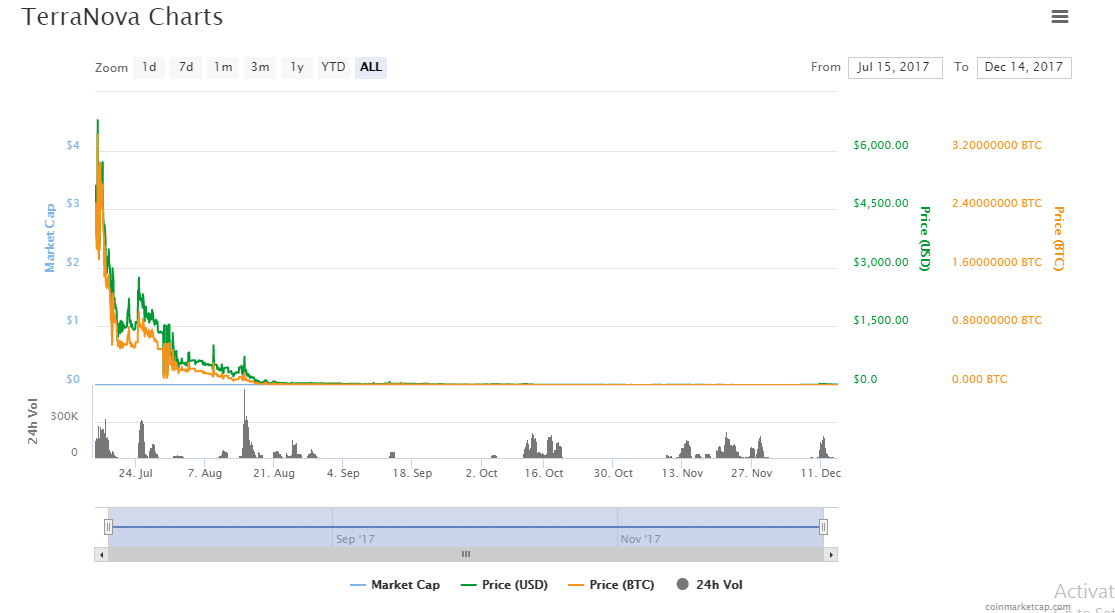 At the time of its introduction in the market, TerraNova rose to an all high of $8,069 within days. Unlike many promising cryptocurrencies such as Bitcoin which have followed an erratic yet gradual and understandable curve, this crypto started on an extreme high. After a few weeks of trading, the price drastically fell to $100. Since August 2017, the price of this alternative coin has been on a downward trend. As of 14th December, its price was $14.7.