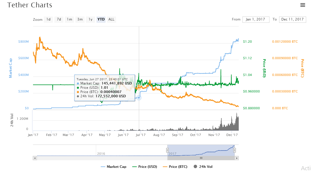 Many of the alternative currencies show exponential growth during the month of December 2017. However, Tether is still in the range of $1.0. It can be expected that only investors who are looking long-term will invest in it. Many crypto enthusiasts are looking for an altcoin whose price will change by the second. Since January when the volumes per day were below one million USD, Tether has grown to reach $1.5 billion as of December 12th. The circulating Tethers in the market today are 839 million USDT while the total supply is 869 million USDT. While the growth of this altcoin is unlikely to be more than that of Ethereum or Bitzeny in 2018, it offers one of the most solid means to store value. Based on the fact that this currency’s value reflects on the underlying asset, it is unlikely that there will extreme shifts in its price.