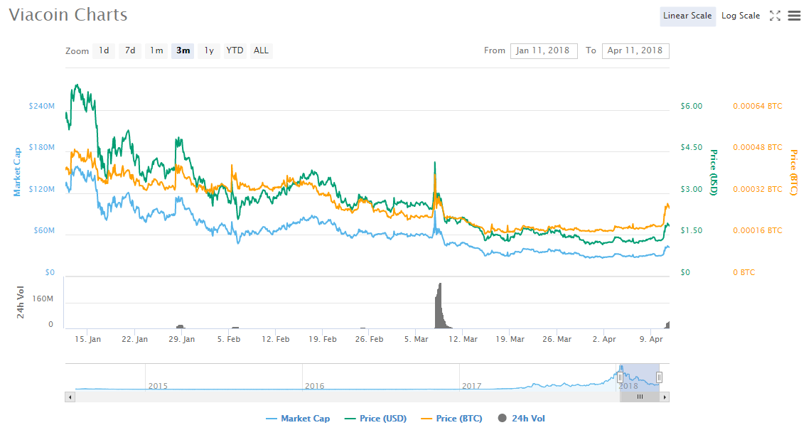 As it is the case with many cryptocurrencies, the introduction of new regulations and also the performance of Bitcoin, ViaCoin surged to reach an all-time high of $7.84 on January 9th. Over the past few months, the crypto has been shedding the value it gained in January. On Tuesday, April 10th, the closing price was $1.55. The market cap at that time was $30 million while 24-hour traded volume stood at $9.9 million. At around 1400 (CET) hours, the volume had surged to surpass $47 million.