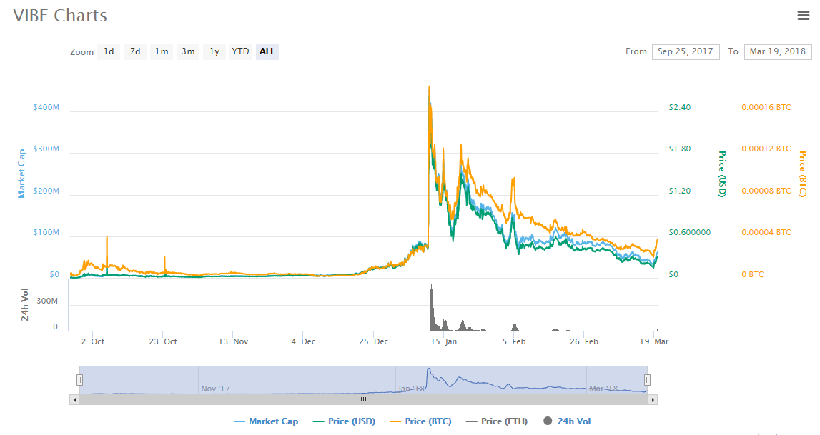 2017 can be called the year when altcoins entered the market en masse. Well, VIBE was one of them. In September 22nd, the price of the coin was trading at $0.02217. Just as it is with many of the altcoins that mirror Bitcoin’s performance, this crypto surged in late December 2017. However, it wasn’t until January 10th that it reached an all high price of $2.7. On February 6th when Bitcoin dropped to a new 2018 low, this crypto plunged to trade at a low of $0.33. The market cap stood at $89 million then. This was a far cry from January 11th when market cap was $413 million.