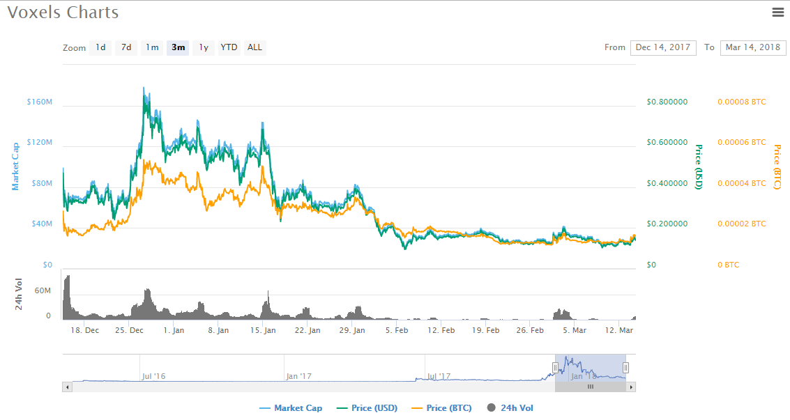In early April 2016, Voxels was commanding a price of more than $0.67. The market cap at the time was at zero. Unlike Bitcoin whose price was growing at a very gradual pace, Voxels was dropping towards a low of $0.008 in January 2017. However, the crypto started regaining at the start of 2017. When the cryptocurrency craze hit the market, Voxels surged to reach a high of $0.8 in January 2018. Market cap at the time stood at $166 million while 24-hour traded volumes were $72 million.