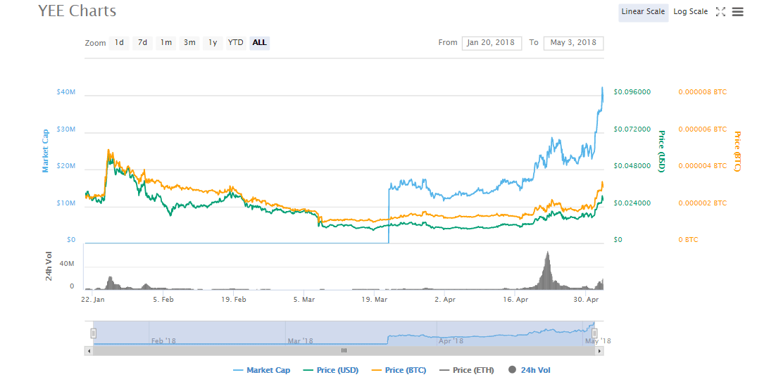 The token started 2018 at a $0.03 before rising to reach $0.05 in the later days of January. Like it was the trend with Bitcoin and other major cryptos, Yee crypto consistently lost value in the following weeks to reach a low of $0.008 on March 18th. But given that the crypto started the year at $0.03 and closed and $0.026 on May 2nd, and nothing much of a fluctuation in the weeks in between, it can be said that the crypto is not one of the most vibrant in the crypto market.
