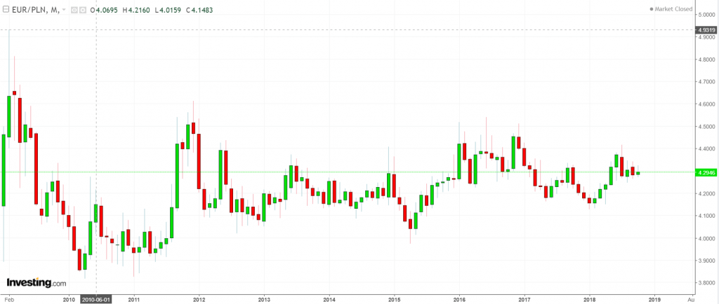 Poland is a country that is not using euro as its currency and is not the participant of ERM II, but since joining EU in 2004 it has a direct obligation to change this. Currently, the state’s currency is Polish zloty (PLN), that has a floating exchange rate, not pegged to euro. The exchange rate of EUR/PLN is 4.30 at the moment of this writing. In terms of interest rates, they are kept as low as 1.5%, whereas inflation in the country is 1.8%.
