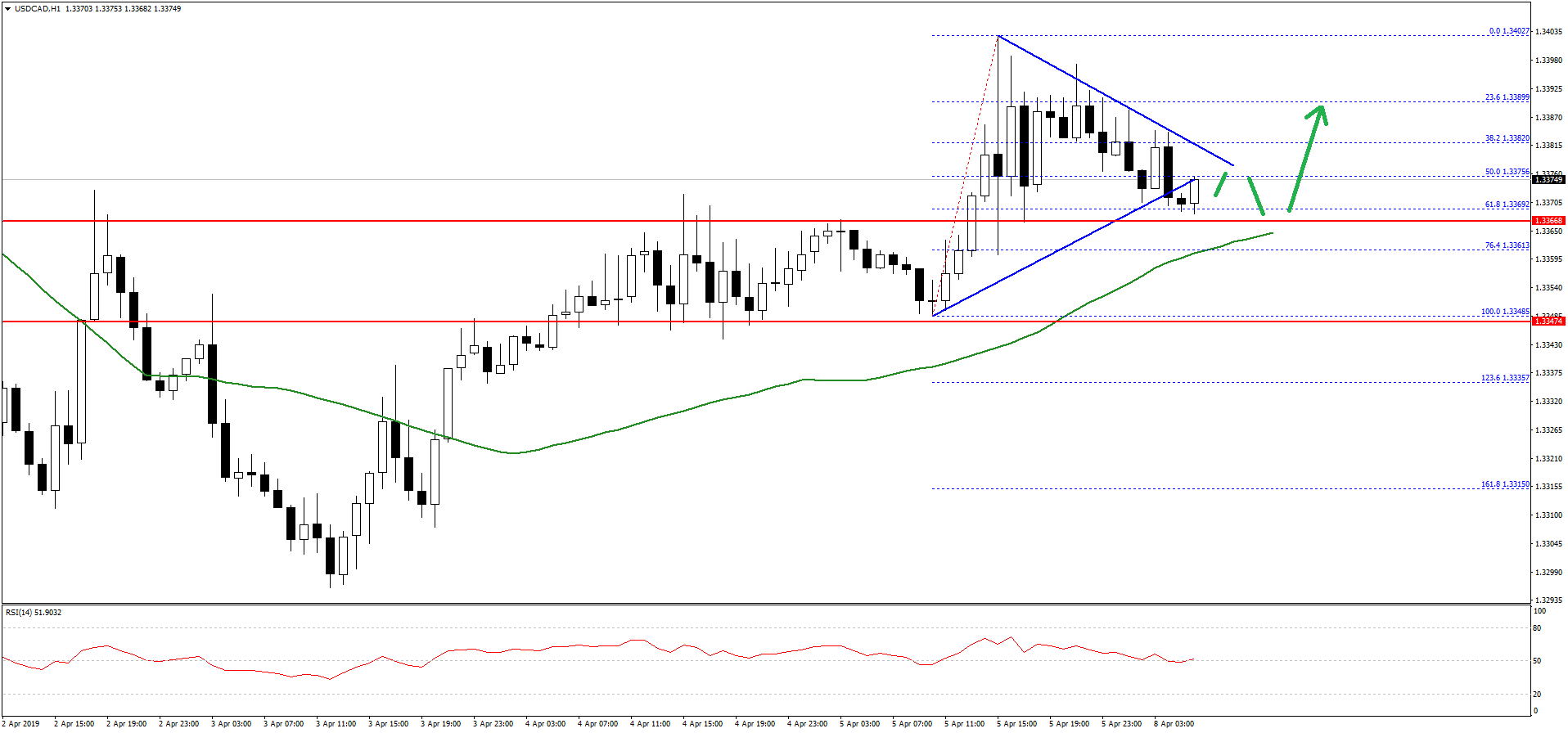 However, there is strong support formed near 1.3370 and the 61.8% Fib retracement level of the last wave from the 1.3348 low to 1.3402 high. In the short term, there could be a couple of swing moves, but the pair is likely to climb above the 1.3385 and 1.3390 levels.