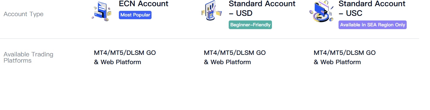 DLSM presents an interesting case when it comes to trading accounts. The broker offers three account types, two of which are available globally, while the third is only for the SEA region. The accounts are ECN, Standard USD, and Standard USC. Below, we will briefly review each of these accounts to define how competitive the broker is and whether it is a cheap broker.