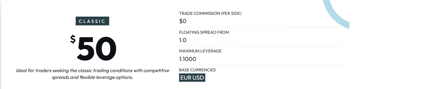 The classic trading account has low minimum deposit requirements and has 0 commissions: