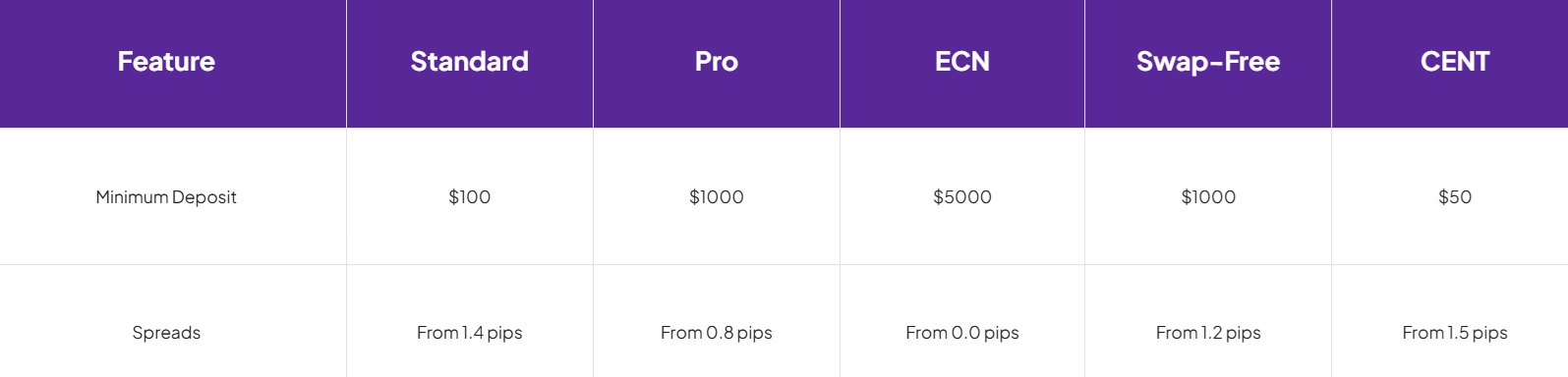 The broker offers access to five different trading accounts, including Standard, Pro, ECN, Cent, and Swap-Free. Each account comes with slightly different trading conditions, spreads, and deposit requirements. Let’s briefly list the trading conditions of each of these accounts to evaluate how competitive the broker is.