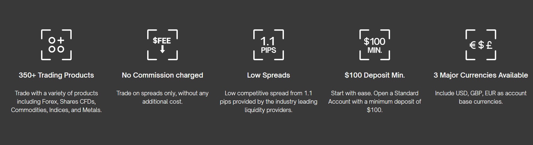 The standard account has a $100 minimum deposit requirement, which is slightly above the competition. Spreads are from 1.1 pips, and trading commissions are zero. These spreads are competitive and slightly on the expensive side from the industry standard of 1 pip on standard accounts. This account includes USD, GBP, and EUR as account base currencies. The maximum leverage is up to 1:500, which is flexible.