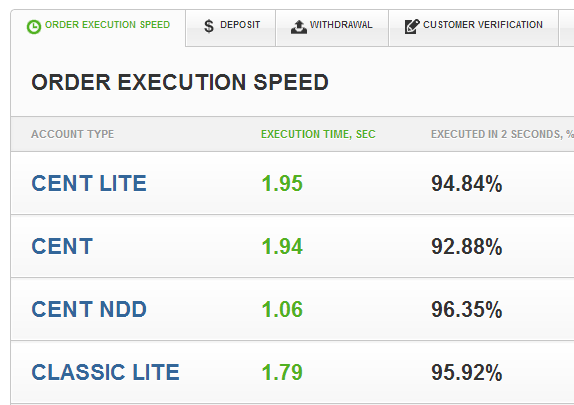 order execution speed, deposits, withdrawals, customer verification and trading service availability. The first category, order execution speed, displays the average order execution times related to each account type during the previous month.