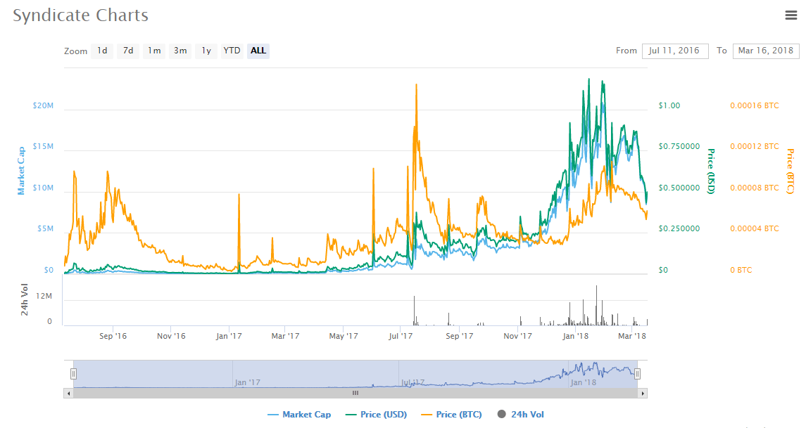 From a small crypto that attracted less than $1000 in daily traded volume in 2016, SYNX grew to touch a high of $12 million on January 28th this year. Like many of the major cryptos, the price of the SYNX rose in January to touch a high of $1.37 before going back down to below $1 in February. The closing price on March 15th was $0.44. Coinmarketcap put the coin at number 14 on the list of the cryptos with the highest number of traded volumes on March 16th.